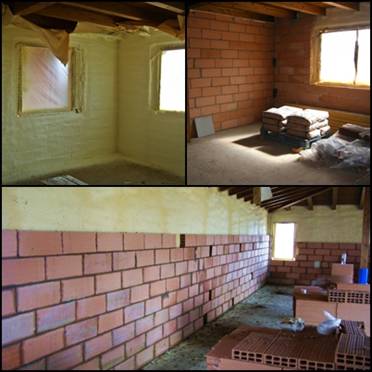El esqueleto ya estaba terminado, al fin íbamos a empezar a trabajar en el interior, resguardados de las inclemencias. Había que conseguir un buen aislamiento, así que primero dimos una capa de aislante, y después otra capa de ladrillos, así la casa conservaría el calor en invierno, y se mantendría fresca en verano.