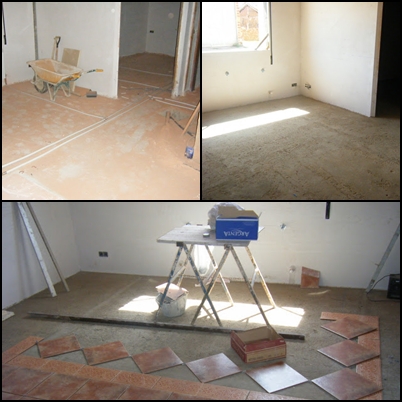 Después montar los tubos de la calefacción por todo el suelo, cubrir con cemento y colocar las baldosas en los comedores y tarima en las habitaciones, con más aislante.